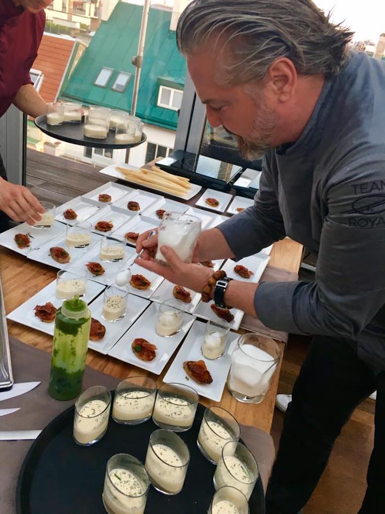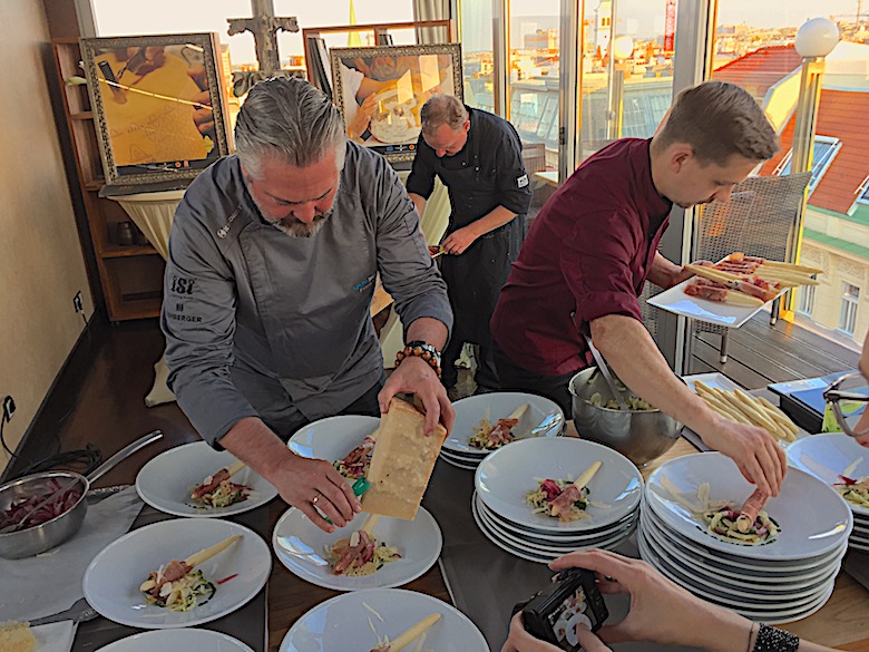 Will heißen, zwei Vorzeigeprodukte höchster Qualität, begleitet von einem Vorzeigekoch mit Phantasie und zeitgemäßen Bartschnitt in einer Vorzeigelocation über den Dächern Wiens mit Stefansdomblick. Fehlte nur noch der ansonsten omnipräsente Dompfarrer Toni Faber, unser Innenstadt-Don Camillo mit Seitenblicke-Affinität. Da es sich aber um eine Einladung für Mitglieder der schreibenden und klickenden Zunft handelte, durften wir uns ganz den irdischen Genüssen widmen.
