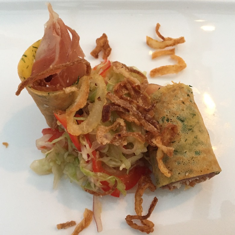 Erwähnte ich zuvor die Alpenbogenüberspannung bei den Zutaten, so kommt diese nun auf den Teller. Gefüllte "Kräuterflädle" (er ist schließlich ein Schwabe!) mit Prosciutto, Frischkäse, Röstzwiebelpesto an Krautsalat und Grana Padano. Also eine Art gefüllte Palatschinke im Friaulformat, die aber im Beisein des Krautsalat geschmacklich zu überraschen wußte. Prädikat: Do schau her!