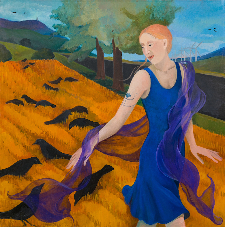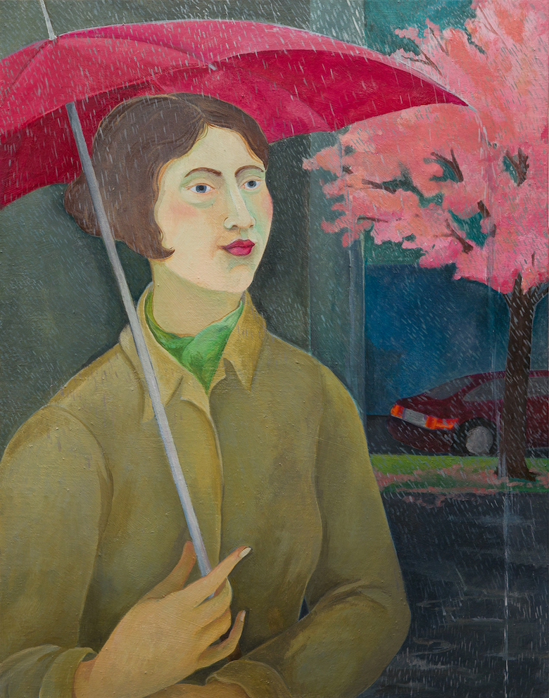 Trieb ist die perfekte Ansicht ebenfalls wichtig: Ihr Hauptmotiv sind Frauen, oft reisende Frauen. Jedem ihrer flächig anmutenden Gemälde liegt dabei eine detailgetreue Skizze zugrunde, die den dahinterliegenden Raum genau vermisst und definiert. Dieser verschwin- det in der Malerei im vordergründig Zweidimensionalen, das Dahinterliegende bleibt trotzdem präsent – dort finden sich die Details der nonverbal erzählten Geschichten: Autos, Landschaften, diverse symbolische Gegenstände als Anspielung auf die Kunstgeschichte, ab und an eine Katze. Geöffnete Türen verweisen auf weitere, nicht näher definierte Räume, Fenster erlauben den Blick in die freie Natur. Je länger man sich aber auf ein Bild einlässt, desto mehr schleicht sich in die vordergründig idyllische Stimmung eine ungewisse Spannung ein. Die Frauen tragen alle das gleiche, makellose, ovale Gesicht, die Augen blicken jedoch ins Leere.