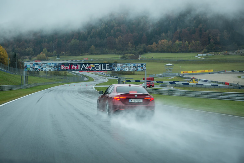 Mein erstes gefahrenes Modell ist die Alfa Romeo Giulia Veloce 2.0 280PS ATX AWD. Auf die Ausstattung achte ich erst später, da der überflutete Red Bull Ring mir meine ganze Konzentration abverlangt. Die Sitzposition ist für mich perfekt, tief im Wagen eingebettet, das Lenkrad variabel nahe am Körper, genug Platz zur Pedalerie. Man verschmilzt mit dem Fahrzeug, dein Popo wird zum feinen Sensorium für die kleinste Bewegung des Hecks, dem trotz Allradantriebs immer noch eine gewisse Bewegungsfreiheit gegönnt wird. Langsam durch die Pitlane, Vollgas auf dem Kurs. Trotz der triefend nassen Fahrbahn volle Traktion für die 280 Pferde und 400Nm Dreh Drehmoment.