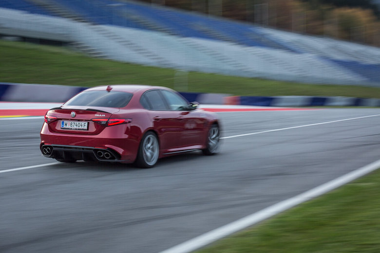 Der Motor ist eine sanfte, aber druckvolle Freude, beeindruckend vor allem aber der hecklastig ausgelegte Allradantrieb, bei dem erst bei drohendem Traktionsverlust die Vorderräder ihre Antriebsfunktion wahrnehmen. 10° Außentemperatur und strömender Regen reichen nicht, um die Giulia nur irgendwie zu beeindrucken. Wie auf Schienen beschleunigt sie brachial aus den Kurven des kleinen Kurses auf dem Red Bull Ring, lenkt entzückend grazil ein und folgt jedem Gedanken des Fahrers. Genau das macht für mich eine Sportlimosine aus, genau deshalb kauft man bei Alfa Romeo. Und genau hier macht sich der Leichtbau bezahlt. All das Alu, all die gesparten Kilos wiegen sich in Fahrfreude auf, im perfekt balancierten Handling der Giulia, die in 5.2 Sekunden auf 100 sprintet und 240km/h erreichen soll. Eine Sportlimosine der Extraklasse, Liebe auf den ersten Blick.