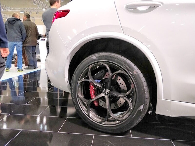 Gebremst wird wahlweise in Stahl oder Karbon in den Größen XL oder XXL ( 390 bzw 398 mm vorne, 350 bzw 360 mm hinten) was den Stelvio Q nach 36,5 m aus 100 km/h wieder zum ruhenden Objekt macht. Solch eine Bremsanlage verlangt nach großen Rädern in der Dimension von 20 Zoll, vorne 255/45, hinten 285/40. Hier erkennt der Fachmann auch schon die freudvolle Auslegung des Italian Stallion. Forza!