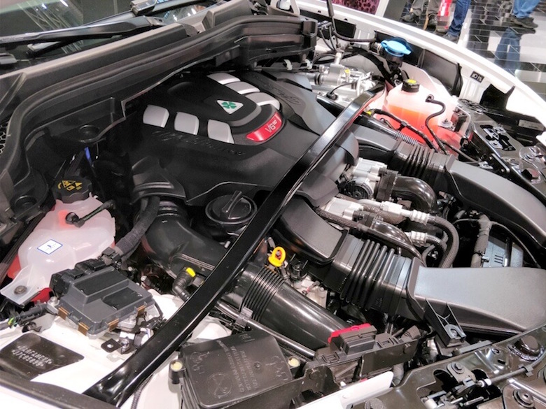 Die Essenz des Alfa Romeo Stelvio Quadrifoglio ist ein 2.9 Liter V6 Biturbo, der 510 PS bei 6500 U/min leistet, 600 Nm zwischen 2500-5000U/min auf die Kurbelwelle wuchtet und einen Topspeed von 283km/h ermöglicht. Und für den Stammtisch: 3,8 Sekunden auf Hundert!