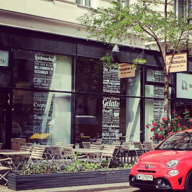 Je enger das Winkelwerk, desto schneller sind wir mit dem Abarth 595 Rivale dort. Nächste Station ist daher der klassische Eissalon Tuchlauben, der bereits 1962 von der Familie Perizzolo gegründet wurde und somit seit mehr als 50 Jahren zu den besten der Stadt gehört. Rosa empfiehlt übrigens Nougat und Cornellkirsche, die in Bio-Qualität aus dem niederösterreichischen Pielachtal geliefert wird.