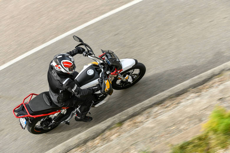 Trotz italienischer Maße von 1,72cm bereiten mir die 830mm Sitzhöhe kein Problem beim Rangieren, abgesessen geht es noch einfacher, weil ja auf der linken Seite kein Auspuff stört. Ich fühle mich angenehm in die Maschine integriert, Kupplungs- und Bremshebel lassen sich über 4 Klicks einfach in der Distanz justieren. Schießt der Strom ein, bilden sich symbolistisch die Schwingen des Adlers in den beiden Scheinwerfern ab, LED ist Ehrensache und die Rückleuchten erinnern an die Nachbrenner eines Kampfjets. Da nehme ich zuerst die Schwingen des Adlers und mache mich mit dem V2 vertraut.