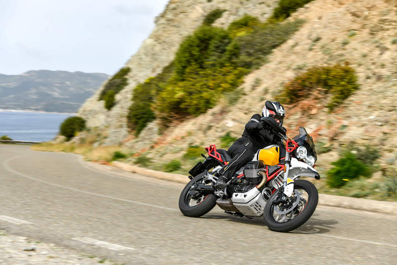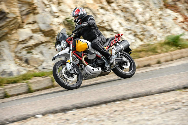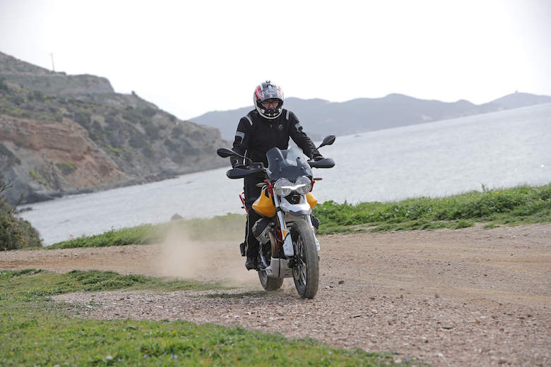 Gas gegeben wird Drive-by-wire, geliefert von Magneti Marelli, was das weite Feld an Assistenzsystemen und Mappings öffnet. Moto Guzzi bleibt aber auch hier klar und transparent. Drei Mappings decken perfekt alle Wünsche ab. Road steht für Straße, das ABS ist vorne und hinten aktiv, und die MGCT Traktionskontrolle im mittleren Sektor, so ferne sie nicht vom Fahrer optional ganz deaktiviert wird. Rain schärft die Traktionskontrolle und gestaltet die Gasannahme sanfter, das ABS ist vorne und hinten aktiv. Offroad ist hier keine Wunschvorstellung, sondern gelebte Realität. Die Traktionskontrolle, soferne nicht ganz deaktiviert, unterstützt nur sachte die Gasstöße des Enduristen, das ABS ist nur noch am Vorderrad aktiv, Könner schalten es gänzlich ab. Die Gasannahme ist schotterfreundlich gestaltet und die Motorbremswirkung verstärkt.