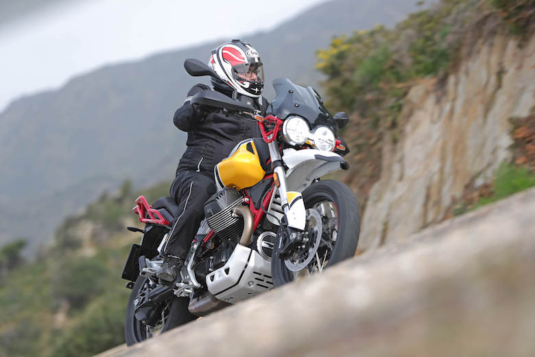 - Das Touring Pack verbessert die Transportkapazität mit 2 Seitenkoffern (33l links, 39l rechts) gefertigt aus Aluminium und einem 41l Topcase, ebenfalls aus 1,5mm dickem Aluminium. Zusätzlich wird ein um 60% größeres transparentes Windshield geliefert, das den Wetter- und Windschutz verbessert. Alle Windshields sind übrigens im Anstellwinkel leicht selbst zu verstellen. Weiters besteht das Touring Pack aus zusätzlichen LED-Leuchten aus Aluminium, einem Motorschutz, Hauptständer und dem Moto Guzzi MIA-System zur Anbindung des Smartphones an das Bike.