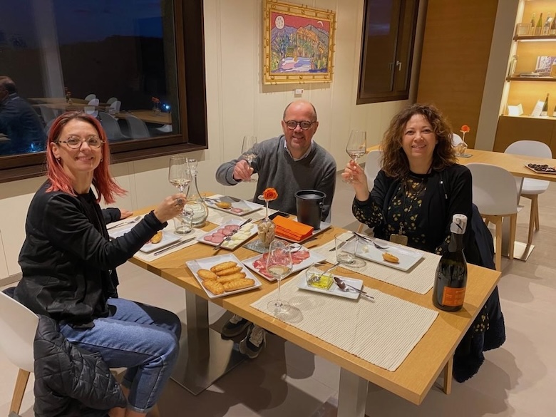 Heute entführe ich Sie aber in die mittelitalienische Region der Marche, wo die Crescia di Pasqua zum Osterfrühstück bzw. den beliebten Osterpicknick gehört. Man könnte sie zu der Familie der Osterpinzen zählen, wobei für uns ungewohnte Zutaten einfließen. Das Rezept stammt von Michela Carbonari und Giulia Tonti (Sie sehen uns oben bei der Arbeit vor Ort in Sachen Verdicchio), mit denen ich in dieser Region gemeinsam die Genussreisen entwerfe – siehe dazu „Genussreisen Marken“.