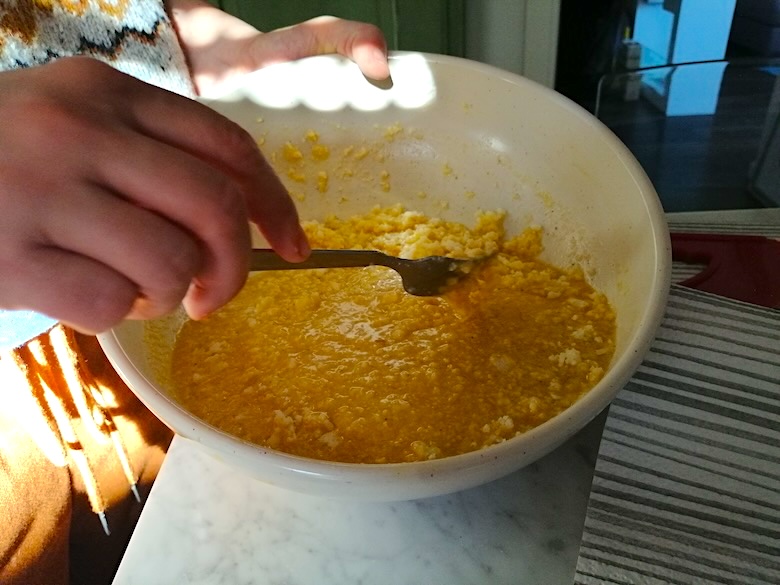 Stellen wir uns also vor, wir befinden uns in der Karwoche in einer Küche in der Gegend zwischen Fano, Pesaro und Urbino. Michela und Giulia haben die Zutaten sorgsam vorbereitet, am Tisch vor uns befinden sich folgende Zutaten: 500 g Mehl, 1 Pkg. Trockenhefe oder frische Bierhefe, 2 TL Zucker, 200 ml lauwarme Milch, 80 ml Olivenöl, 2 Eier, 10 g Salz, 150 g Grana Padana oder Parmesan (aufgerieben),80 g Pecorino (aufgerieben)