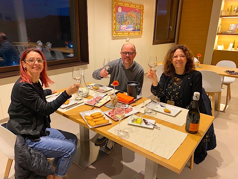 Mein kulinarisch suchender Blickwinkel fokussiert sich auf die mittelitalienische Region der Marche (Marken), wo die Crescia di Pasqua zum Osterfrühstück bzw. dem beliebten Osterpicknick gehört. Man könnte sie zu der Familie der Osterpinzen zählen, wobei ein paar für uns ungewohnte Zutaten einfließen. Das Rezept stammt von Michela und Giulia. Diese beiden Damen (im Bild unten mit mir bei der Arbeit bei einem Winzer in Sachen Verdicchio!) organisieren für mich seit Jahren die Genussreiseprogramme in Ihrer Heimatregion, wissen so um den Stellenwert von Genuss und Tradition nur zu gut Bescheid.