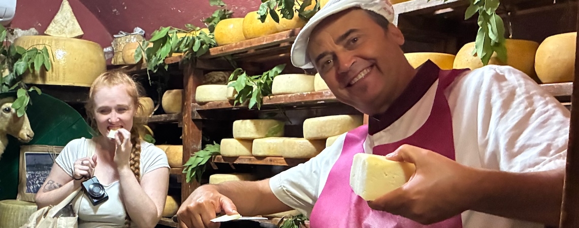 - Ganztägiger Ausflug mit Genussguide (in englischer Sprache) mit Besuch eines skurillen Feinkostladens (Verkostung Salumi / Formaggi) + einer kleiner Käserei mit eigener Zucht (Verkostung Pecorino), am Rückweg beim Winzer, ebenso mit Verkostung