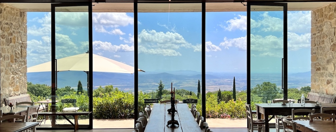Der gute Mann heißt Martin Kerres und hat sich seinen Traum vom grenzenlosen Raum im Süden der Toskana erfüllt. Sein Faible für Nachhaltigkeit findet in der modern gehaltenen Stein-/Holz-/Glasarchitektur des Weinguts bzw. der Zimmer ihre Fortsetzung. Kräftige Farben und ein modulhaft gedachtes Raumkonzept, dazu der Fernblick aus allen Lagen. Nicht zu vergessen ein Swimmingpool mit Panoramablick bis hin zur Isola Giglio.