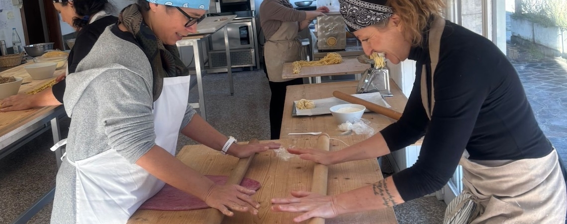 Nachmittags wird’s gschmackig: Wir rollen den Teig aus, schwingen das Nudelholz und lernen, wie man echte Mantovanische Pasta selbst macht.